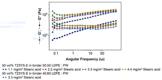 Figure 2b shows a strong shear thinning behavior, which is generally expected for highly filled polymeric materials. To investigate the influence of SA on the rheology in more detail, oscillatory measurements were done. During the sample preparation for the oscillation measurements, it was recognized that the feedstock with the amount of SA = 1.1 mg/m2 was not flexible enough at the measuring temperature to be squeezed into the gap of 1 mm. The pressure to close the gap down to 1 mm had been too high for manual sample preparation. Therefore, and for better compatibility, all materials were measured at a gap of 2 mm.