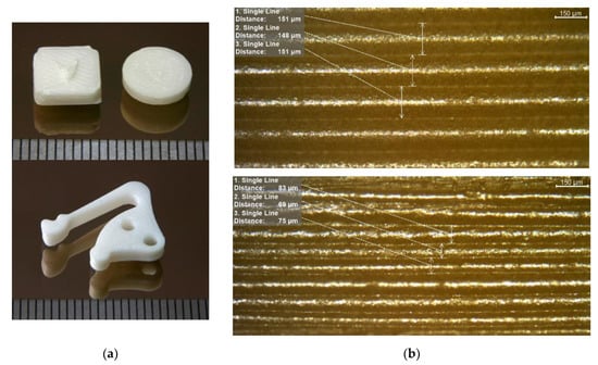 Sintered zirconia samples: (a) Test structures for density measurements and lever arm type sample (distance between dark lines at the bottom is 1 mm); (b) Measurement of printed layer thickness as smallest geometric feature.