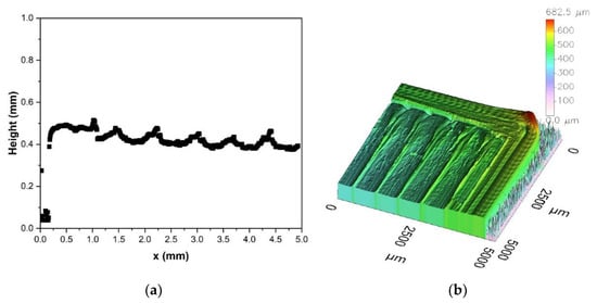 Surface profile of a printed greenbody: (a) 2D-scan perpendicular to printing direction; (b) 3D-scan.