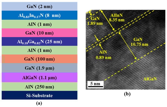 (a) Schematic structure and (b) high-resolution transmission electron microscopy image of epitaxial layers.