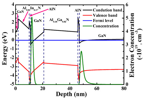 Simulated band diagram and electron concentration distribution in epitaxial layers.