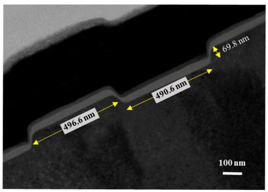 The double channel epitaxial layers for fabricating AlInN/GaN/AlGaN/GaN MOSHEMTs were grown on a silicon (Si) substrate by metal-organic chemical vapor deposition (MOCVD, AIXTRON Group, Herzogenrath, Germany). Trimethylgallium (TMG), triethylgallium (TEG), trimethylaluminum (TMA), trimethylindium (TMI), and ammonia (NH3) were the precursors. Hydrogen and nitrogen were used as the carrier gases. The designed epitaxial layers, illustrated in Figure 1a, consisted of an AlN nucleation layer (250 nm), a step-graded AlGaN buffer layer (1.1 μm), an undoped GaN buffer layer (1.9 μm), a GaN channel 1 layer (100 nm), an AlN spacer layer (1 nm), an Al0.18Ga0.82N barrier 1 layer (25 nm), a GaN channel 2 layer (10 nm), an AlN spacer layer (1 nm), an Al0.83In0.17N barrier 2 layer (8 nm), and a GaN cap layer (2 nm). The AlN and AlGaN layers were grown at 1040–1100 °C in hydrogen ambient using TMG, while the Al0.83In0.17N layer was grown at 765 °C in nitrogen ambient using TEG in order to incorporate enough indium to the layer so as to achieve the same lattice constant as GaN’s. From the high-resolution transmission electron microscopy (HRTEM) image (JEOL Ltd., Tokyo, Japan) depicted in Figure 1b, the growth thicknesses of the epitaxial layers were similar with the designed thicknesses. Furthermore, as observed in Figure 1b, the channel region shows good matching with low dislocation density. Using a 1-dimensional (1D) Schrödinger-Poisson solver, the simulated band diagram and electron concentration distribution of the epitaxial layers are depicted in Figure 2. The simulation showed that double 2-DEG channels were constructed by the induced polarization in Al0.18Ga0.82N/GaN interface (channel 1) and the band discontinuity in lattice-matched Al0.83In0.17N/GaN interface (channel 2). Electron mobility of 1770 cm2/V-s and sheet electron density of 1.11 × 1013 cm−2 in the double channels were obtained using Hall measurement (Ecopia Corp., Anyang, South Korea)at room temperature.