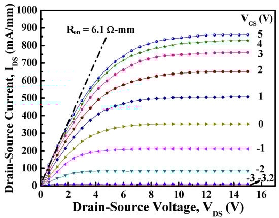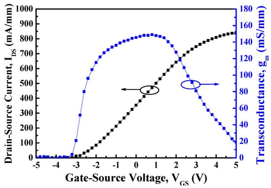 Figure 4 depicts the HRTEM image of the fin-channel. From the observation of HRTEM image, the height, width, and spacing of the multiple-mesa-channel were 69.8 nm, 496.6 nm, and 490.6 nm, respectively. Consequently, the total real channel width within a 50-μm-wide gate region was about 25.2 μm. By applying various gate-source voltage (VGS) levels, typical drain-source current (IDS)–drain-source voltage (VDS) characteristics of the studied devices, shown in Figure 5, were obtained using the measurement of an Agilent 4156C semiconductor parameter analyzer. Under the operating voltage of VDS= 10 V, its normalized saturation drain-source current was 352.0 and 842.7 mA/mm of the devices at VGS = 0 V and 5 V, respectively. At the operating voltage of VDS = 10 V, the dependence of drain-source current and extrinsic transconductance (gm) on gate-source voltage are depicted in Figure 6. Maximal extrinsic transconductance was 148.9 mS/mm. In general, the double-hump transconductance behaviors were caused by the effective gate modulation of the upper and lower channels in the double-channel MOSHEMTs, respectively [8,9,10]. However, double-hump transconductance characteristics did not appear in the gm–VGS curve of the studied devices. In the studied devices, the wider smooth gm value distribution caused by the collapse paving of double-hump transconductance behavior was contributed to the superior gate control of fin-channel. The superior gate control was attributed to the side-wall electric field modulation in the fin channel. By defining the on-resistance (Ron) as the inverse slope of the IDS–VDS characteristics at VGS = 5 V and VDS = 0 V, the associated on-resistance of 6.1 Ω-mm was obtained. Furthermore, when threshold voltage (Vth) was defined as the gate-source voltage corresponding to the drain-source current of 1 μA/mm, Vth was −3.2 V. To measure high-frequency performance of the studied devices using an Agilent 8510C network analyzer, Figure 7 illustrates the small-signal high-frequency performance of frequency-dependent short-circuit current gain and maximal available power gain. Figure 7 shows that the unit gain cutoff frequency (fT) and maximal oscillation frequency (fmax) were 6.5 and 12.6 GHz, respectively. In general, to evaluate electron trapping and electron detrapping behaviors induced from defects, traps, and interface states residing in electronic devices, the measurement of low-frequency noise performance was effective [21]. Under the operation of VDS = 1 V, Figure 8 depicts the frequency (f)-dependent normalized noise power density spectra () of the studied devices measured by an Agilent 4156C semiconductor analyzer, an HP 35670A dynamic signal analyzer, and a BTA 9812B noise analyzer. The normalized noise power density gradually decreased with an increase in gate-source voltage. Due to the quite good variation between normalized noise power density and 1/f, flicker noise was the dominant noise of the devices. At the operating condition of f = 10 Hz, VDS = 1 V, and VGS = 5 V, the normalized noise power density was approximately 8.7 × 10−14 Hz−1. Using a mobility fluctuation model [22], Hooge’s coefficient α, a useful figure-of-merit parameter, could be expressed as: