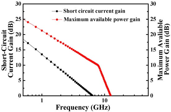 Short-circuit current gain and maximum available power gain as a function of frequency of MOSHEMTs with multiple-mesa-fin-channel array.