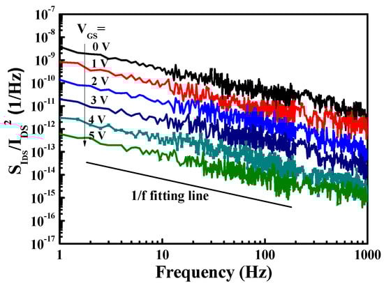 where LG =1 μm and WG = 25.2 μm are the gate length and real gate width on multiple-mesa-fin-channels, respectively. The nch = 1.11 × 1013 cm−2 is the sheet electron density of the double-channel and Vth = −3.2 V is the threshold voltage. By substituting those parameters into Equation. 1, the α value of 6.25 × 10−6 was calculated for devices operating at f = 10 Hz, VDS = 1 V, and VGS = 5 V.