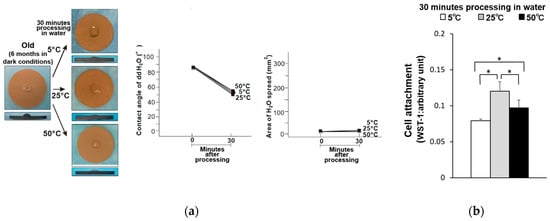 (a) Hydrophobicity/hydrophilicity of the old–wet titanium disk surfaces illustrated as a photograph of 10 µL ddH2O placed on the sample surface before and after temperature deviation (left) with the corresponding contact angle (middle) and spread area (right). (b) Initial attachment of osteoblasts to the old–wet titanium disk surfaces. * p < 0.05, statistically significant difference.