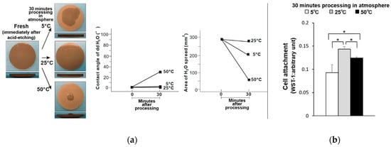 (a) Hydrophobicity/hydrophilicity of the fresh–dry titanium disk surfaces illustrated as a photograph of 10 µL ddH2O placed on the sample surface before and after temperature deviation (left) with the corresponding contact angle (middle) and spread area (right). (b) Initial attachment of osteoblasts to the fresh–dry titanium disk surfaces. * p < 0.05, statistically significant difference.