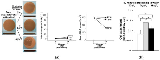 (a) Hydrophobicity/hydrophilicity of the fresh–wet titanium disk surfaces illustrated as a photograph of 10 µL ddH2O placed on the sample surface before and after temperature deviation (left) with the corresponding contact angle (middle) and spread area (right). (b) Initial attachment of osteoblasts to the fresh–wet titanium disk surfaces. * p < 0.05, statistically significant difference.