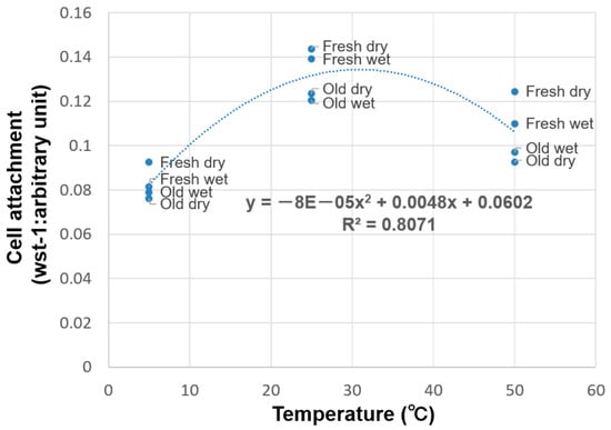 Commercialized implant bodies are often roughened to enhance osseointegration [,,,,,,,,,,,,,,], where acid treatment is the most common surface treatment method [,,,,,,]. The surface-treated implant body is subsequently packaged dry or in solution (e.g., water or saline solution) before transportation and storage. Thus, this study investigated the effect of temperature deviations on acid-treated titanium stored under dry and wet conditions. The temperatures investigated were 5 °C, 25 °C, and 50 °C, which represent the temperatures during transportation and storage. Body temperature (37 °C) is a very important temperature for osteoblast culture and is the set temperature of the incubator. Figure 5 shows that cell attachment increases at temperatures near 37 °C. However, this temperature is not included in this study because the study was focused on temperature fluctuations during transport and storage, prior to implant placement in the oral cavity. In addition, pH is an important factor governing cell culture and function of biological cells in the oral cavity. A CO2 incubator was used in the present study under an established condition of temperature and CO2 concentration. Under the condition, culture medium is supposed to work as a buffer and maintains the pH. In fact, the pH of the culture medium was measured in this study, with or without titanium disks with different temperatures. The medium showed a slightly alkaline pH value, which was not affected by the presence of a titanium disk of room temperature and of high and low deviated temperature.