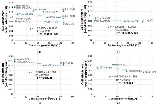 Relationship between initial cell attachment and hydrophilicity: (a) overall (R = −0.35), (b) at 5 °C (R = −0.77), (c) at 25 °C (R = −0.88), and (d) at 50 °C (R = −0.70).