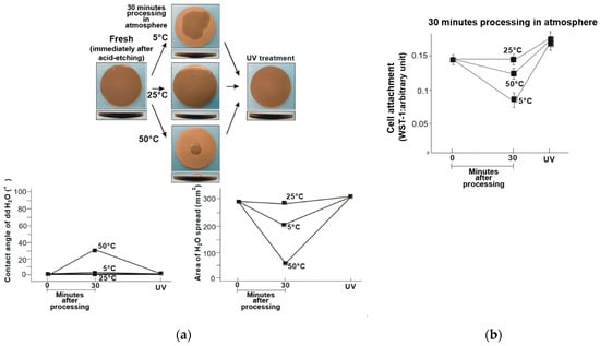 (a) Hydrophobicity/hydrophilicity of the UV-treated fresh–dry titanium disk surfaces illustrated as a photograph of 10 µL ddH2O placed on the sample surface before and after temperature deviation (upper middle) with the corresponding contact angle (lower left) and spread area (lower right). (b) Initial attachment of osteoblasts to the UV-treated fresh–dry titanium disk surfaces.