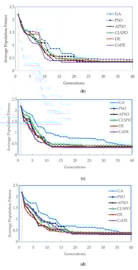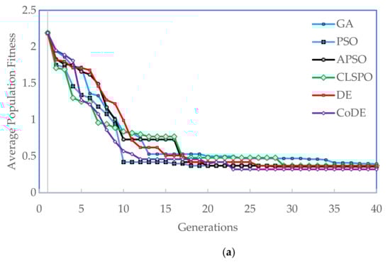The performance of DE depends on the strategy used to generate trial vectors and how well the control parameters are tuned to solve the specific problem. A variant of the differential evolution algorithm called the composite differential evolution (CoDE) [] combines the three most popular trial candidate generation strategies with three control parameter settings, which are used in a random manner to generate trial candidates. It has a simple structure and is easy to implement. The three trial vector generation strategies for CoDE used in this paper are rand/1, best/1, and current-to-best/2. The parameters discussed in this section for the three algorithms and their variants are presented in Table 3. Some of these parameters were tuned in a test environment prior to deployment, while other parameters were assigned based on information in literature.