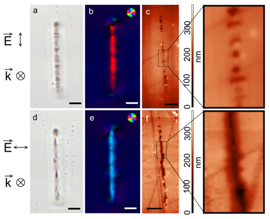 (a,d) Optical microphotographs; (b,e) pseudocolor maps of the slow axis of birefringence; (c,f) AFM images of the tracks inscribed by the laser beam with the polarization parallel (top) and perpendicular (bottom) to the track orientation, respectively (writing conditions: 10 kHz, 3 μm/s, 250 nJ, 600 fs). E—electromagnetic field vector, k—wave vector of the laser beam. The scale bars are 5 µm.