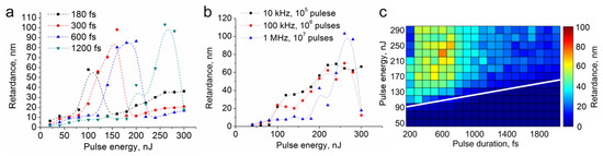 Then we studied the influence of the laser exposure parameters on the formation of birefringent nanogratings in more detail. It turned out that, like in the case of sodium borate glass [10], a low pulse repetition rate and long duration are favorable for the formation of nanogratings. For example, at the lowest available pulse duration of 180 fs, nanogratings could be formed only at a repetition rate of 1 MHz in a narrow pulse energy range of 100–120 nJ. Within an increase of the pulse duration the pulse energy range of nanogratings formation shifts towards higher values (Figure 2a). A decrease in the repetition rate leads, firstly, to an expanding of the pulse energy range and, secondly, to a decrease in the minimum number of pulses required for the form birefringence appearance (Figure 2b), i.e., from 107 pulses for 1 MHz, to 104 in the case of 10 kHz.