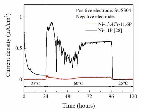 Figure 11 shows the current density-time curve of galvanic couples of SUS304/brazed Ni-11P alloy coating [28] and SUS304/brazed Ni-13.4Cr-11.6P alloy coating measured in a 0.06 M/L NaCl solution. At a temperature of 25 °C, current scarcely flowed in both of the galvanic couples during the first 24 h of immersion. With the temperature increased to 60 °C, a current density of up to 1.0 µA/cm2 flowed in the SUS304/brazed Ni-11P alloy coating galvanic couple, indicating that the brazed Ni-11P alloy coating was corroded. At the same temperature, only a current density of up to 0.07 µA/cm2 flowed in the SUS304/brazed Ni-13.4Cr-11.6P alloy coating galvanic couple, suggesting that the brazed Ni-13.4Cr-11.6P alloy coating has a better corrosion resistance than that of the brazed Ni-11P alloy coating. The current flow in the galvanic couples can be attributed to the increase in potential difference between SUS304 and the brazed alloy coatings at 60 °C (as shown in Figure 10), which acts as a driving force to promote the corrosion process [29]. When the temperature was restored to 25 °C, the current density of both galvanic couples dropped to approximately 0 µA/cm2.