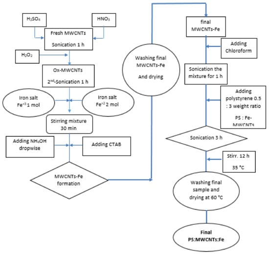 Schematic flow chart for the PS:MWCNTs:Fe nanocomposite preparation.
