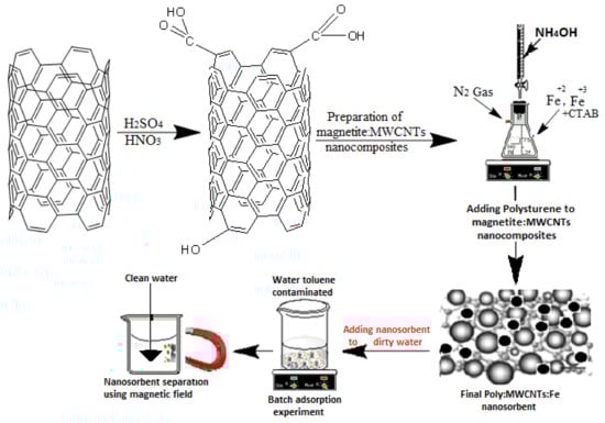 Chloroform was used for the dissolution of polystyrene. At first, 100 mg of Fe-MWCNTs/L of chloroform was sonicated at 50 °C for 1 h. Then, polystyrene was added to the mixture in a 1:3 PS:Fe-MWCNTs weight ratio. The mixture was sonicated for a further 3 h. The mixture was then mixed with a magnetic stirrer for 24 h at 40 °C using a hot plate [34]. The final PS:MWCNTs:Fe nanocomposites were formed. The sample was separated, washed, and then dried at 50 °C overnight. The magnetic property was successfully achieved in the prepared nano-sorbent (PS:MWCNTs:Fe). Figure 1 presents the schematic flow chart for the preparation of the PS:MWCNTs:Fe nanocomposites.