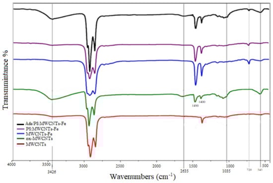 Figure 4 shows the FTIR spectra for all prepared samples. The 3425 and 1625 cm−1 bands belong to water, while the bending vibrations at 2925, 2845, 1460, and 1395 cm−1 are attributed to the C–H stretching mode of the aromatic ring, C–H stretching in the branches, C=C aromatic ring stretching, and C–C stretching for the MWCNTs, respectively. After acid treatment, MWCNTs (ox-MWCNTs) and the generation of a carboxyl group could have resulted in the formation of bands at 3420, 1490, and 1400 cm−1 related to the stretching vibration of the O–H group in carboxylic acid and the vibration of the C=O carboxyl and C–O stretching bond of free –COOH groups, respectively. The improvement in the peak height at 720 cm−1 for Fe-MWCNTs in Figure 4 confirms that the metal oxide (Fe–O) was bonded onto oxygen in the carboxylic groups through the –COO– magnetite bonds. After the adsorption process of toluene using PS:MWCNTs:Fe in Figure 4, the improved peaks at 2925 and 2845 cm−1 are indicative of the C-H stretching mode of the aromatic ring and the C–H stretching in the –CH3 in toluene, respectively. The FTIR bands appearing at 1035 and 545 cm−1 are attributed to in-plane and out-of-plane C–H bending, respectively [23,34,35,36]. Table 1 shows the peak assignments and type of vibration for all prepared sorbents [37].