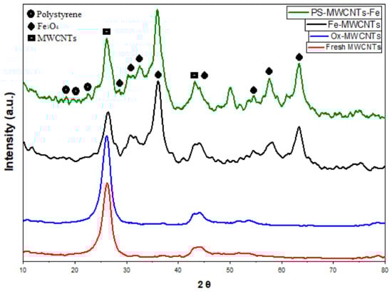 The XRD patterns for fresh MWCNTs, ox-MWCNTs, Fe-MWCNTs, and PS: MWCNTs:Fe nanocomposites.