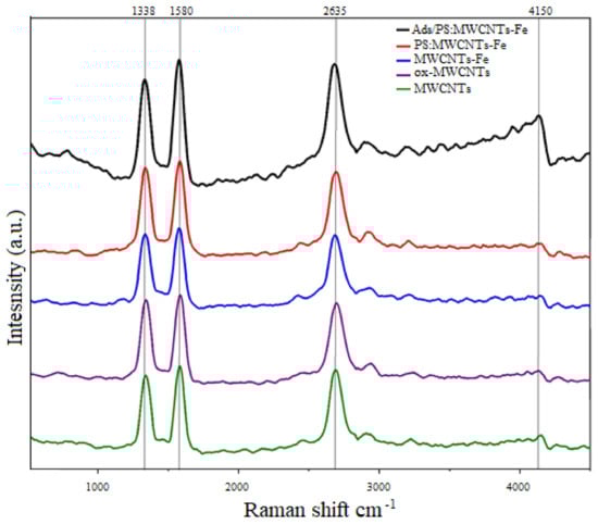 Raman spectroscopy analysis was used to characterize the fresh MWCNTs, ox-MWCNTs, Fe-MWCNTs, PS:MWCNTs:Fe, and toluene adsorption-MWCNTs. There are three sharp peaks at 1338, 1580, and 2635 cm−1 in all samples, which correspond to the disorder-induced band (D band), the Raman allowed tangential mode (G band), and the second-order harmonic band G’ (Graphite) band, attributed to the overtone of the D and G bands, respectively [42,43,44]. The Raman spectrum shows a second-order harmonic band G’ (Graphite) at 2635 cm−1 corresponding to the D + G bands. In the case of oxidized MWCNTs (ox-MWCNTs) and then modified with magnetite (Fe-MWCNTs), which is represented in Figure 6, the D, G, and G’ were changed, and then after adding polystyrene to the Fe-MWCNTs and PS:MWCNTs:Fe nanocomposites formed, the D, G, and G’ bands were significantly improved. This is related to bonding of the polymer in Fe-MWCNTs. The Raman spectrum was performed for PS:MWCNTs:Fe nanocomposites after toluene adsorption, as can be seen in Figure 6, where the enhancement of peaks’ resolution leads to another band issued at 4150 cm−1 that refers to toluene adsorption on the PS:MWCNTs:Fe nanocomposites.
