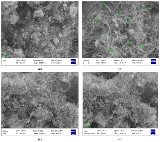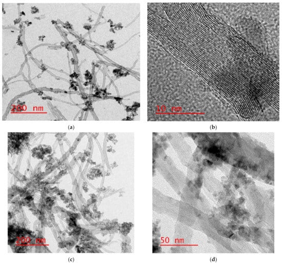 The applications of nanotechnology have brought a considerable revolution in materials science, and researchers have flocked to it because of the impeccable properties shown by nanomaterials, such as higher sorption rate, super-hydrophobicity, super-oleophilicity, and greater mechanical strength [10]. Multi-walled carbon nanotubes (MWCNTs), compared with other nanomaterials, have shown a relatively higher affinity of adsorption for removal of volatile organic compounds, as reported by Parmar et al. [11], for the removal of heavy metal ions [12] and for the degradation of dyes [13]. Likewise, nowadays, MWCNTs are considered as potential adsorbents for numerous remediation applications, especially in the environmental field, including removal of organic pollutants and heavy metals from aqueous media [14,15]. The synthesis methods for carbon nanotubes’ (CNTs) preparation are usually selected in light of the required suitable properties and the specific field of application where these synthesized nanomaterials will be used.