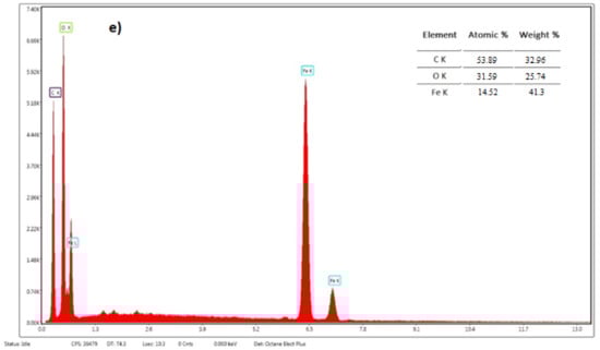 The scanning electron microscopy (SEM) images for the prepared nanocomposites are shown in Figure 7. Taking into consideration that the magnetite nanoparticles were prepared over MWCNTs in a ratio of 1:1, it was pointed out according to Figure 7a,b that Fe3O4 particles prepared over MWCNTs were well within the nanoscale, and the shapes were found to be nanotubes; hence, it is clear that there are no effects on the shape of the carbon nanotubes during oxidation of the MWCNTs with a strong acid and even after the magnetite/MWCNTs nanocomposites’ preparation. After modification of MWCNTs/magnetite with the polymer, PS:MWCNTs:Fe has been very clearly shown in Figure 7c,d, pointing out that the mixing of polystyrene during the nanocomposites’ preparation helps the agglomeration of the MWCNTs and magnetite particles. The TEM images in Figure 8a,b show MWCNTs-magnetite nanocomposites. The images indicate that there is no effect on the tubular shape of the CNTs during the preparation and when the magnetite nanoparticles appear over the MWCNTs. Figure 8b shows that the magnetite nanoparticle diameter is less than 10 nm. Figure 8c,d show the PS:MWCNTs:Fe nanocomposites, from which it was also observed that the agglomerations of the magnetite particles occur after the addition of polystyrene. Similarly, the tubular shape of the CNTs is still not affected even after the process of the nanocomposites’ preparation is completed. Energy dispersive X-ray (EDX) analysis was carried out for Fe-MWCNTs. Figure 8e shows the presence of magnetite (Fe3O4) over the MWCNTs, taking into consideration the presence of the iron, oxygen, and carbon atoms, as can be seen from EDX analysis.