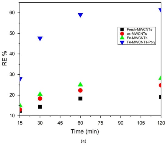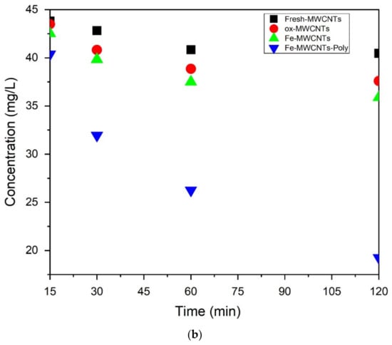 Different contact times were used (15, 30, 60, and 120 min) to study the removal of toluene using fresh MWCNTs, Fe-MWCNTs, and PS:MWCNTs:Fe nano-sorbents. The initial toluene concentration was 50 mg/L in all batch experiments, the solution volume was 50 mL, and the weight of the samples was 2 mg. Figure 9a,b show the removal efficiency and decrease in the concentration of toluene during the process time. The PS:MWCNTs:Fe nano-sorbent achieved the highest removal efficiency and the highest decrease in toluene concentration after 60 min as compared with fresh MWCNTs and Fe-MWCNTs.