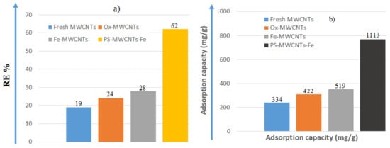 The highest removal efficiency of 62% was achieved using PS:MWCNTs:Fe, which also exhibited the highest adsorption capacity of 1072 mg/g, as can be seen in Figure 10a,b.
