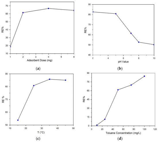 The effect of different adsorbent doses was studied using PS:MWCNTs:Fe nanocomposites. A range of adsorbent doses (1, 2, 4, and 6 mg of PS:MWCNTs:Fe nanocomposites) were used to study the removal efficiency of toluene from water. The following parameters were used: 60 min at ambient temperature, 50 mL solution volume, and 50 mg/L toluene concentration. The results indicated that a 2 mg dose of PS:MWCNTs:Fe nanocomposite exhibited the best removal efficiency of toluene, as shown in Figure 11a.