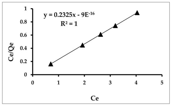 Figure 13 is the linear plot of Ce/Qe as a function of Ce, where Ce is the equilibrium concentration of toluene while Qe is the amount of toluene at the adsorbent surface. The results indicated that the Langmuir isotherm was obeyed, which suggests that the adsorption is a monolayer and homogenous [61,62].
