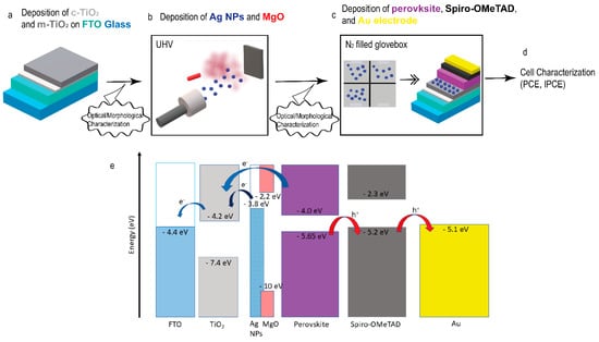 (a) Representation of the initial substrate, from bottom to the top: conductive glass substrate (blue) (2.2 mm) covered with an FTO layer (aquamarine) (around 700 nm), compact TiO2 layer (light gray) (around 50 nm), mesoporous TiO2 layer (gray) (around 150 nm). (b) Scheme of the NP (dark blue) synthesis and deposition with MgO (red) on top of the previously realized m-TiO2 layer. (c) Top view scheme of the experimental device until the m-TiO2 layer (see the left part of scheme c), containing four independent cells, three of them with NPs and one used as the reference cell, while the right part of scheme c represents the addition of the perovskite layer (violet) (around 400 nm), Spiro-OMeTAD layer (black) (250 nm) and gold layer (yellow) (around 100 nm); NPs are localized at the interface between the perovskite and mesoporous TiO2 layer. The dimensions of each layer displayed here are not to scale. (d) Final step of characterization of the engineered solar devices. (e) Energy band diagram of the device. The work function values for FTO, TiO2 have been taken from references [66,67]. The highest occupied molecular orbital (HOMO) and lowest unoccupied molecular orbital (LUMO) levels for perovskite have been taken from reference [68]. The energy band edge positions for Spiro-OMeTAD have been taken from reference [69]. The energy band values for Ag NPs and MgO are taken from reference [70] and [71], respectively. The depicted energy values are relative to the vacuum level. Blue and red arrows show the direction of electron and hole motion, respectively.