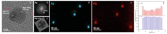 In Figure 2d, the EDXS map corresponding to the Ag-L (cyan) edge clearly reveals a few rounded Ag NPs, whose diameter is estimated to be around (10.0 ± 0.6) nm. The Mg map (Figure 2e) provides evidence of the preferential adsorption of MgO on top of Ag NPs, while the EDXS line profile from a single NP reported in Figure 2f shows that Mg has a higher concentration at the edge of the NP, as previously found in similar systems [61] and as expected by a thin capping layer.
