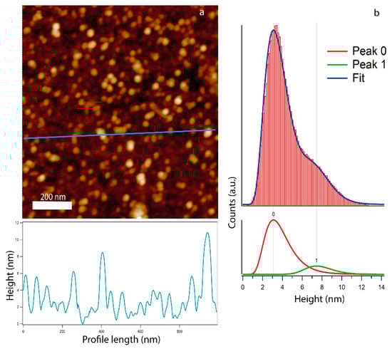 Deposition on the flat TiO2 substrate also allows us to investigate the NP height distribution by means of AFM topography. In Figure 4, the topography of the Ag/MgO on TiO2 is reported (Figure 4a), along with the relative height distribution (Figure 4b). The latter appears clearly as bimodal and it is fitted with two log-normal components: the first component (peak 0) can be ascribed to the surface roughness of TiO2 film bare areas with an average height value <h0> = 3 and FWHM = 2 nm (as shown in Figure S2, the bare TiO2 substrate is characterized by a surface roughness of 3 nm), while the second component (peak 1) corresponds to the NP height distribution, with mean value <h1> = 7.3 and FWHM = 2 nm (Figure 4b). A fair estimate of the average NP height can be given by subtracting the average values of the two components, resulting in a value <h> = 4 nm (see also references [81,82]).