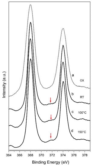 XPS (a) Ag 3d core level of bare Ag NPs after air exposure, (b) Ag 3d core levels at room temperature (RT), (c) Ag 3d core levels at 100 °C and (d) Ag 3d core level at 150 °C. The system used was glass/FTO/c-TiO2/m-TiO2/Ag NPs/MgO. The red arrows highlight the plasmonic features.