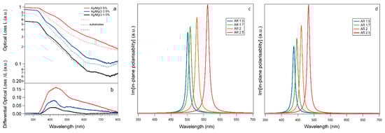 It is well known that the NP optical absorption response is highly influenced by nanoparticle shape—especially their aspect ratio (AR) [87]—as well as by the dielectric properties of the embedding material, while it is fairly independent from NP size, at least for diameters in the 5–40 nm range [88]. For bare, spherical Ag NPs, the LSPR is localized at 390 nm [47], while it shifts to higher wavelengths if NPs are embedded in a solid-state matrix [84,88], the shift being higher the larger the matrix refractive index. Following the Maxwell Garnett approach [89] (see Supplementary Materials for further details), we have computed the imaginary part of the Ag NP in-plane polarizability for different values of the NP AR [90] and of the matrix dielectric function. Indeed, as occurs in the case of other metal oxide materials, the MgO UV–Vis dielectric function is known to vary with the film thickness t, becoming smaller than in the bulk for films thinner than t~250 nm [91,92]. In Figure 6c, the imaginary part of the NP polarizability is calculated for different values of AR ranging between 1.5 and 2.5, using the dielectric constants of bulk Ag and MgO, taken from reference [93]. In this case, a red shift of the LSPR maximum from ~500 nm to ~570 nm is observed upon AR increasing. Figure 6d shows, instead, the imaginary part of the NP polarizability calculated using the smaller dielectric constant of a thin MgO layer, as taken from the literature [94]. In this case, all the spectra are blue shifted, the AR = 2 moving from 520 to 460 nm, in fair agreement with the maximum position measured for the 1.5% coverage. As previously discussed, the distribution of NP AR values is expected to broaden with increasing NP film coverages—with larger NPs having higher AR—thus explaining the observed broadening of the LSPR peak. On the other hand, particle interconnections can also influence the values of plasmonic resonance mode at high coverages, contributing to the overall broadening [95,96].