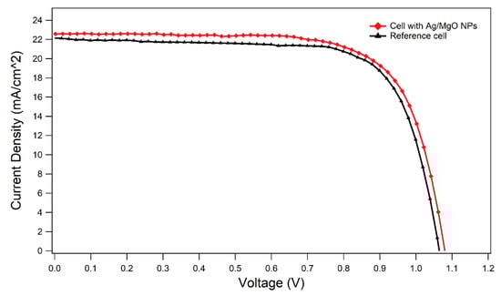 J-V curves for both the best reference cell without Ag/MgO NPs (black curve) and the best optimized device with NPs (red curve).