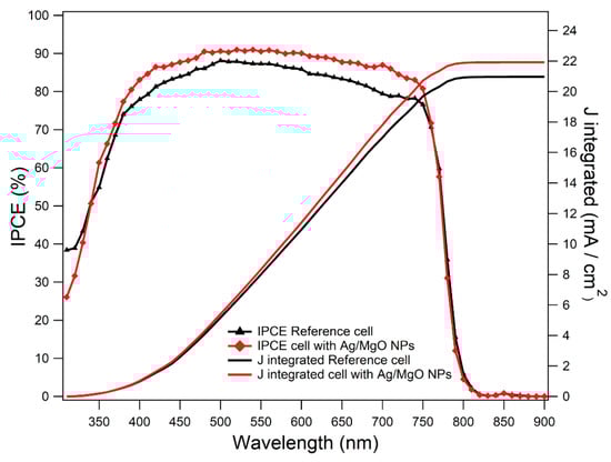 IPCE spectra for both the best-performing device with Ag/MgO NPs (red) and the best reference device (black) and their integrated current density; the J values registered are coherent with those shown in Table 2 under a solar simulator, with a percentage difference of 3% and 4.7% for the devices with and without NPs, respectively.