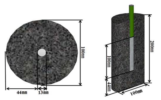 To measure the corrosion behavior of the rebars embedded in concrete and evaluate the corrosion area, a reinforced concrete specimen was prepared. The reinforced concrete specimens were prepared by fixing a ϕ13 mm rebar (SD-400 deformed) at the center of a Ø100 × 200 mm cylindrical mold and then pouring the concrete into the mold. After cleaning the rebar surface by grit blasting, an epoxy coating was applied to the surface to observe the penetrating effect of the NaCl from the concrete immersed in the NaCl solution; only a length of 100 mm at the center of the concrete specimen was exposed. Figure 1 illustrates the fabricated reinforced concrete specimen. The specimen was demolded 24 h later and cured for 28 days.
