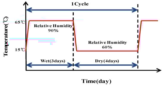 As one of the test methods to accelerate corrosion of the reinforced bars, the wetting-drying process was used. Wet–dry cycles accelerate corrosion due to the presence of excess water, and high temperature and humidity, thereby facilitating the diffusion of oxygen. However, as the water content increases, the diffusion of oxygen decreases; accordingly, the temperature and humidity are lowered so as to encourage diffusion and promote further corrosion. This approach was applied in the cycles performed herein to accelerate corrosion of the embedded rebars in concrete [24,25]. Figure 2 illustrates the cycle conditions.