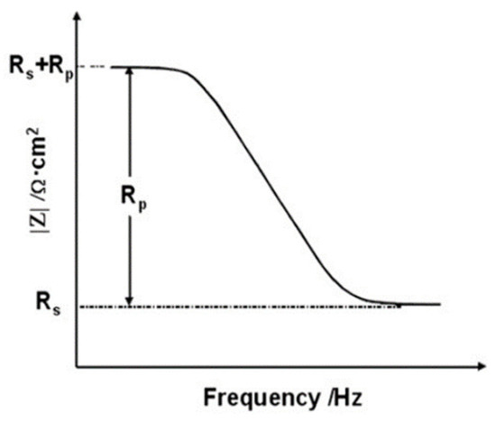 Rs corresponds to the impedance at the highest frequency and Rs + Rp corresponds to the impedance at the lowest frequency. For the rebar-embedded concrete, the Rp of the rebar accounts for contributions from the resistance of the film Rf and the charge transfer resistance Rct [14,15,16,17]. Therefore, the corrosion resistance of the rebars can be represented by Rp. In EIS, it can be assumed that the value of the Bode plot at 100 kHz is equal to Rs and that at 0.1 Hz is equal to Rs + Rp. Therefore, Rp can be calculated.