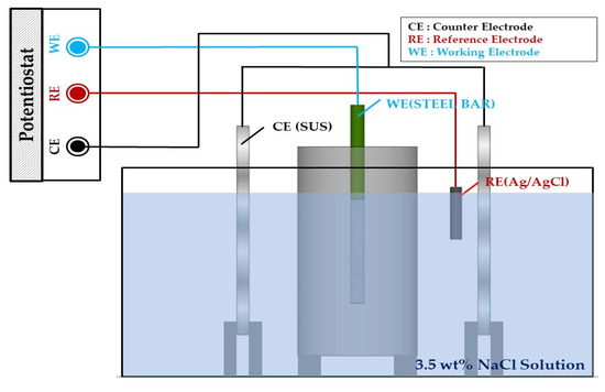 EIS was performed to measure the impedance of the reinforced concrete after each wet–dry cycle [27,28,29,30] using a potentiostat (PGSTAT302N, Metrohm Autolab B.V., Utrecht, The Netherlands). A three-electrode system was employed, using the rebar as a working electrode (WE), SUS304 as a counter electrode (CE), and Ag/AgCl as a reference electrode (RE). Additionally, before performing EIS for every week of the wet–dry cycle, the rebar was immersed in 3.5 wt% NaCl solution at 25 °C. The experiment is illustrated and summarized in Figure 5 and Table 4 [31].
