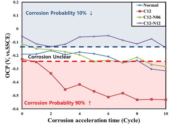 Accordingly, the equilibrium electrode potential of the rebar in the concrete was measured to quantify the degree of corrosion of the rebar. The OCP of the rebar as a function of the accelerated corrosion time is shown in Figure 6.