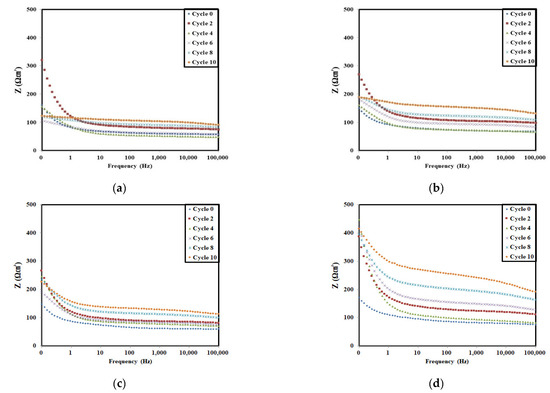 The Bode modulus plots of all test specimens at the selected accelerated corrosion cycles are shown in Figure 7.