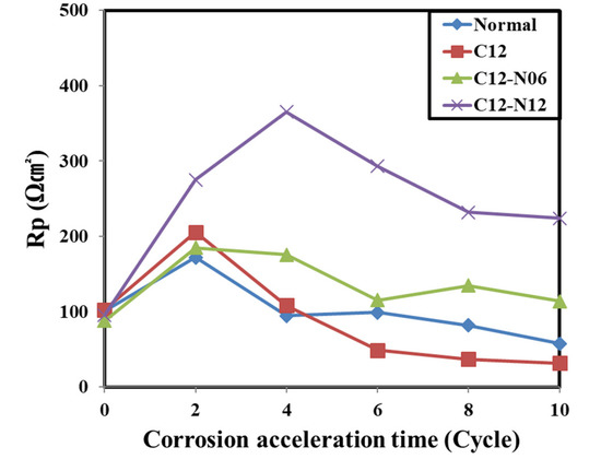 For the normal, C12, and C12N6 concrete specimens, the Rp of the embedded rebars increased until the second week of the accelerated corrosion cycles and decreased after the fourth week. This can be attributed to the degradation of the passive films of all embedded rebars as they enter the initial stages of corrosion.