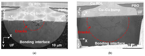 Figure 6a,b shows the electron images in the x-z plane. Various cracks are present at the bonding interface. There is no gap among the UF, PBO, RDLs, and Cu–Cu bumps. The Cu–Cu bumps are uniformly surrounded by the UF. The cracks at the bonding interface in Figure 6a are much smaller than those in Figure 6b, but their difference in resistance change is only 4%. Some Cu grains recrystallized, and further little grains grew at the center of the bonding interface. Several zig-zag cracks propagated along the fine grains in Figure 6c. In contrast, the cracks are straighter in Figure 6d because the grains did not recrystallize and grow across the weak grain boundaries to form triple junctions at the bonding interface [42,43]. This difference was caused by the microstructure of as-fabricated Cu–Cu bumps in Figure 4c,d. In Figure 4c, there are many recrystallized fine grains at the bonding interface after the 300 °C/90 MPa/30 s bonding with some remaining triple junctions. During TCTs, those fine grains grew further across the bonding interface. On the contrary, the as-fabricated Cu–Cu bumps bonded at 300 °C/31 MPa/10 s did not have many recrystallized fine grains at the bonding interface. Thus, their bonding interfaces were straight and weak, which led to severe cracking after 1000 thermal cycles.