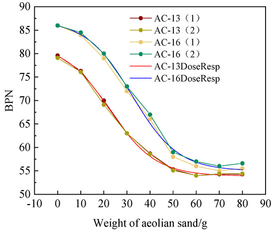 - As the number of sand accumulation increases, the BPN values of AC-13 and AC-16 mixtures show a downward trend. By fitting the DoseResp model, the later changes can be predicted based on the changes in the initial BPN value.