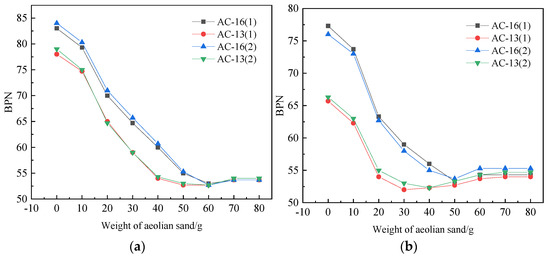 As shown in Figure 10a, when the amount of aeolian sand with the water content of 5% increases to 10 g, the BPN values of the two mixtures decrease by 4.9% and 4.5%, respectively. At this time, the AC-13 decreases. The amplitude is more significant than AC-16. The analysis believes that the air voids content and texture depth of AC-13 is less than AC-16. Under the interference of water and sand, the decrease of BPN value is slightly more significant than AC-16. With the increase of sand accumulation, the anti-sliding performance of the two mixtures decreases and finally tends to be stable. During the whole process, the BPN values of the two mixtures decrease by 28.5% and 35.7%, respectively. When the water content of aeolian sand is 10%, as shown in Figure 10b, the initial BPN value of the two mixtures decreases overall. The initial value of AC-13 is significantly lower than AC-16. When the amount of sand increased to 30 g, the BPN value droped to the lowest point. The BPN value of AC-16 reached the lowest point when the amount of sand increased to 50 g. There was a slight rebound. Among them, the BPN value of AC-13 rebounded by 3.1% and 4.4%, and the BPN value of AC-16 rebounded. The margins were 1.9% and 2.4%. The analysis shows that water becomes the lubricant between the sand, which makes the micro-bearing system formed by the wheel sand road more significant. The wet sand exists between the wheel and the road like a ball, and the anti-sliding ability drops sharply at this time.