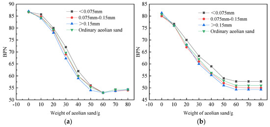BPN value of aeolian sand with three particle sizes existing alone on the road surface. (a) BPN value of aeolian sand with three particle sizes existing alone on the AC-16 pavement surface; (b) BPN value of aeolian sand with three particle sizes existing alone on the AC-13 pavement surface.