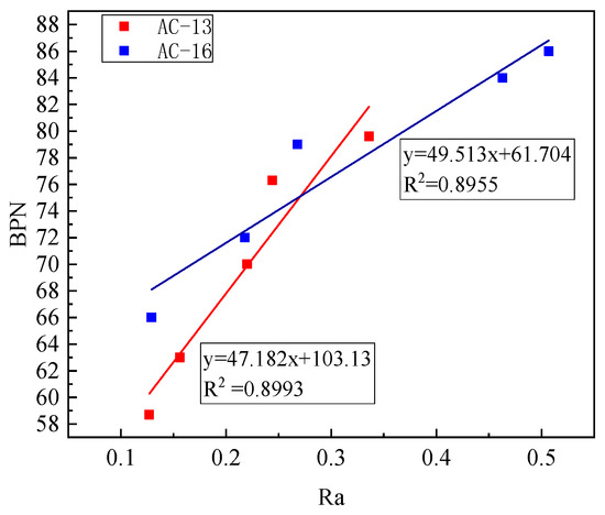 The correlation analysis between the BPN value and three texture indicators of MPD, Ra, and Rq was performed. As shown in Figure 14, BPN and Ra values have an excellent linear relationship, indicating that the increase of aeolian sand make the contour of the pavement structure. The slope of the trend line for AC-16 is more significant than that for AC-13.