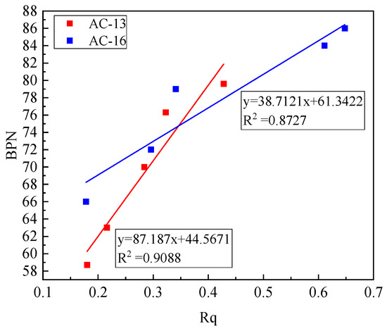 The BPN value and Rq of the two mixtures were fitted, and the results are shown in Figure 15. There was also an excellent linear relationship between the BPN value and Rq. The goodness of fit for AC-13 is 0.9088, and for AC-16, 0.8727. The increase of the contoured root means square deviation Rq will cause the increase of the BPN value. The two are in direct proportion, indicating that the more the amount of aeolian sand on the road surface, the stronger the filling capacity of the road surface. At this time, the road surface texture decreases, and the BPN value also increases. It decreases accordingly.